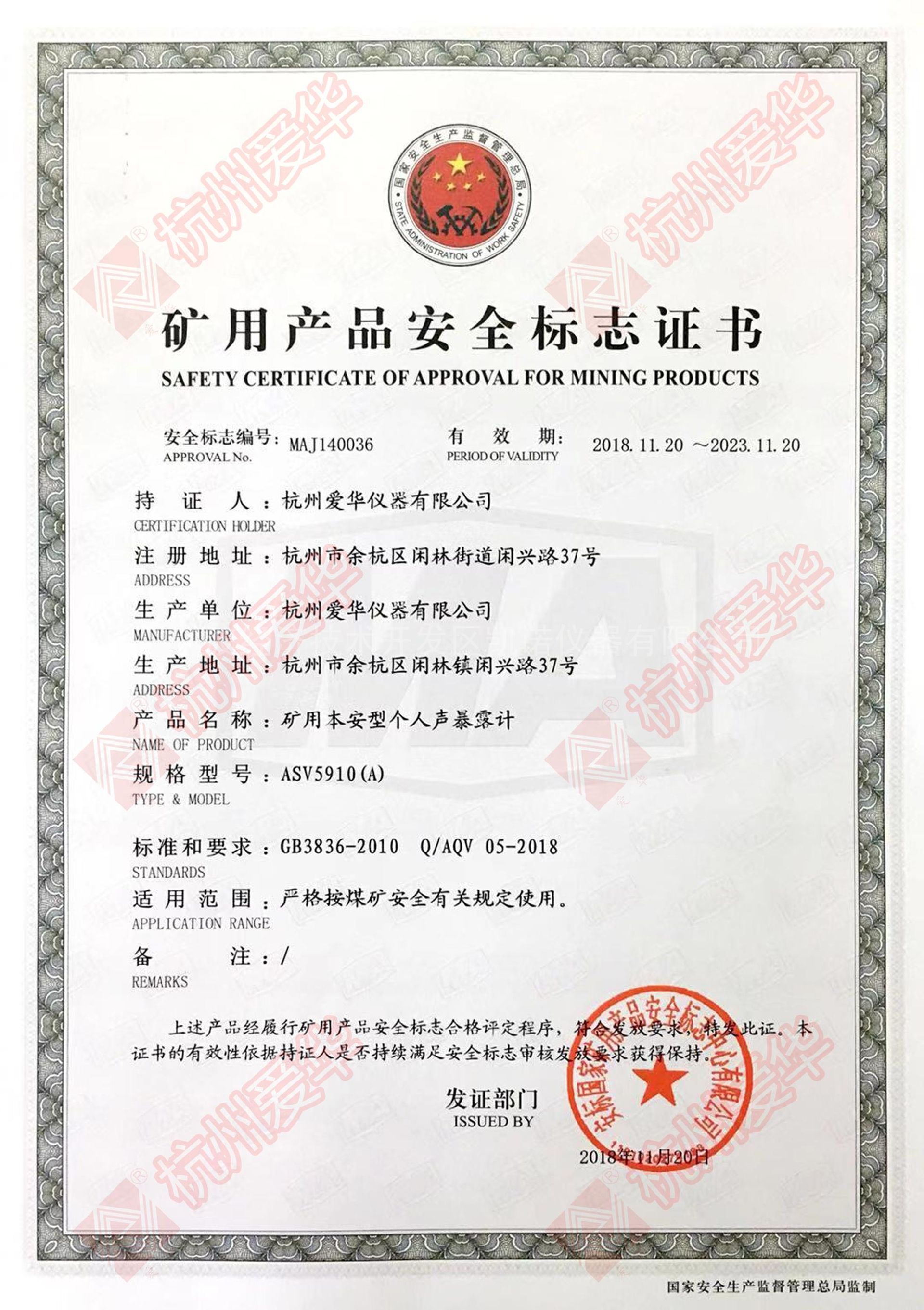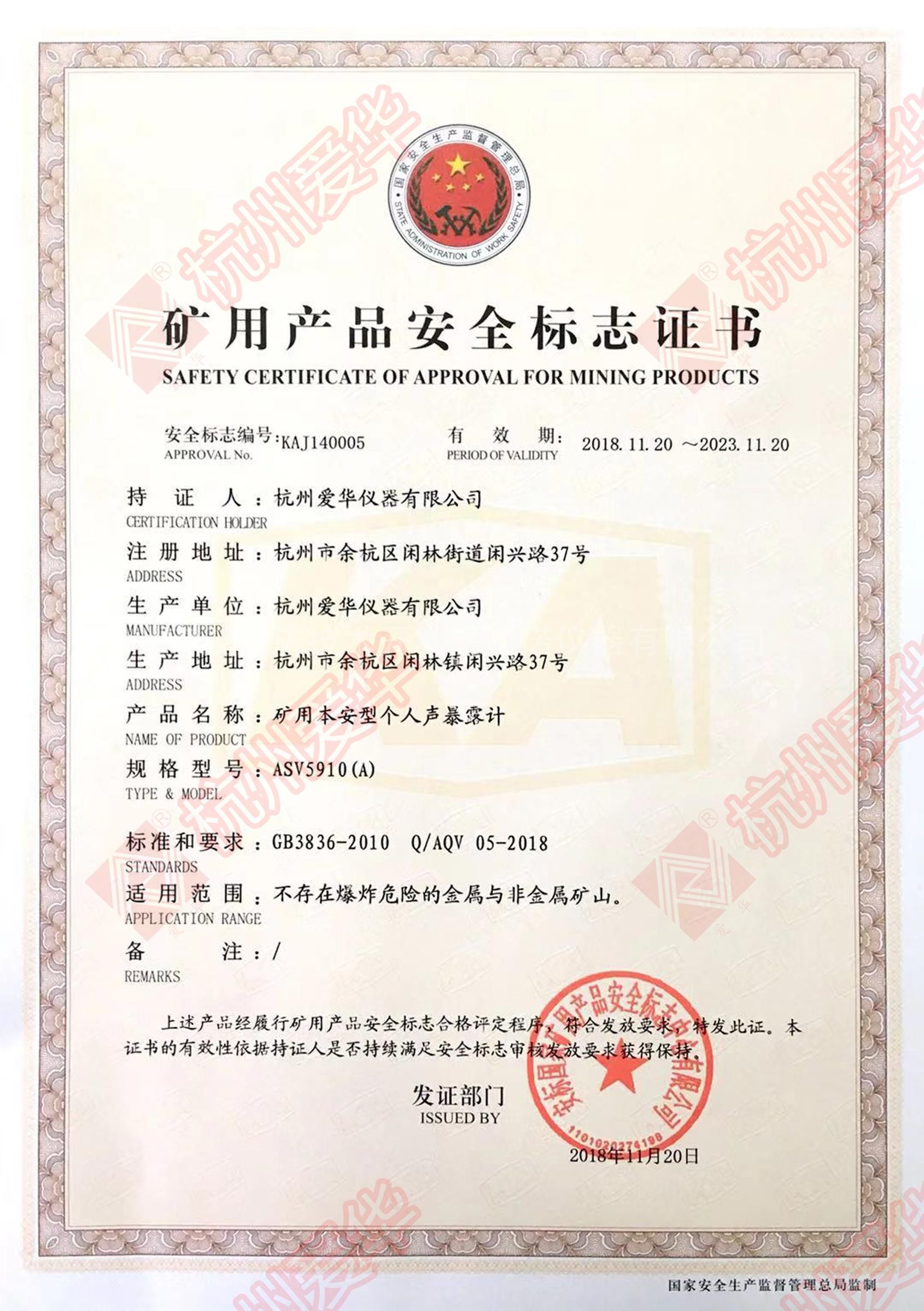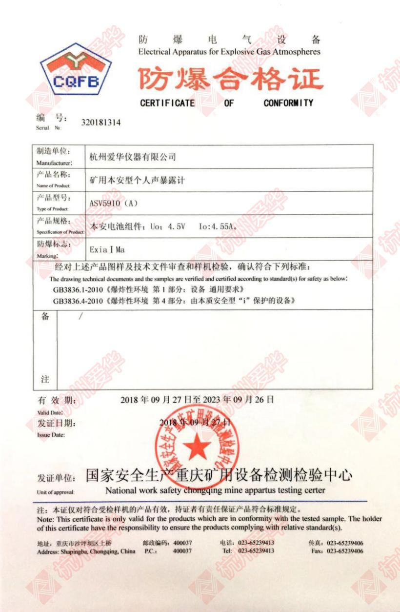 爱华ASV5910矿用防爆个人声暴露计zui新证书资质