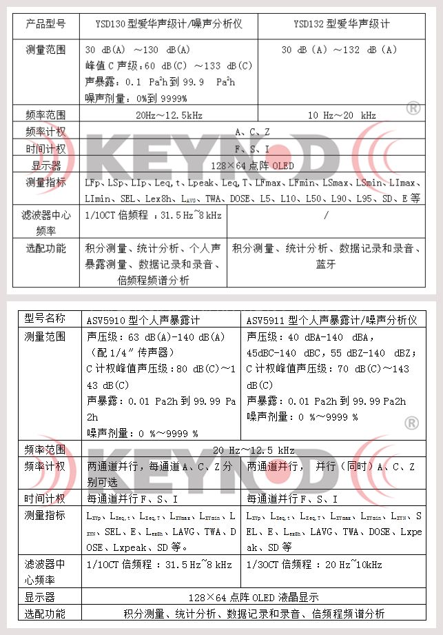 具体产品参数对比图如下:宁波凯诺仪器主营销售爱华噪声测量和噪声振动测量产品: