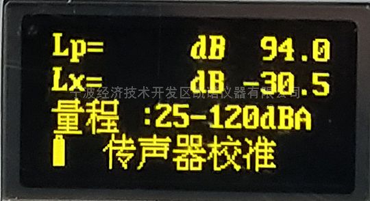 用“光标”键,将光标移到声校准,按“进入”键,仪器进入声学校准界面,显示如下: “Lp= dB 94.0”:后面的94.0为声校准器的标称声压级,也就是仪器将校到的声压级。Lp= 后显示的是校准过程中仪器测量到的声压级。“Lx= dB -30.0”:后面的-30.0 为0 号传声器的灵敏度级。Lx=后显示校准过程中新校准出的传声器灵敏度级。用声校准器套在传声器上,并打开声校准器开关,按下“进入”键,仪器就开始校准过程了,显示屏右下角显示一个1 到9的数值,当显示9 后停止,表示校准结束。再按“进入”键则将当前新校准出的传声器灵敏度级保存起来。