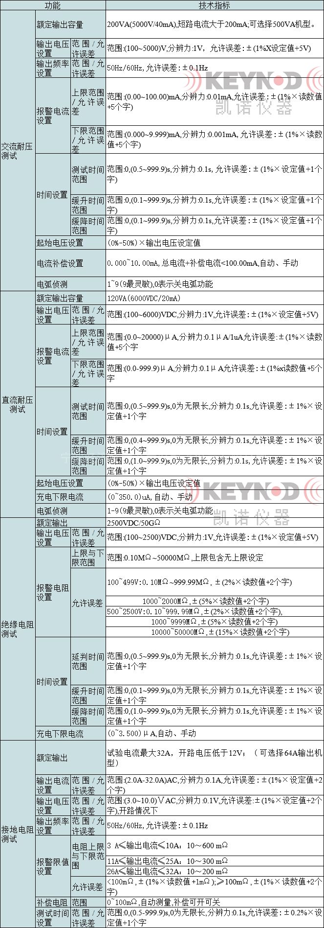 1.三合一、四合一功能:交流耐压、直流耐压、绝缘电阻、接地电阻;开短路测试、电弧侦测(详见分类对比表)。