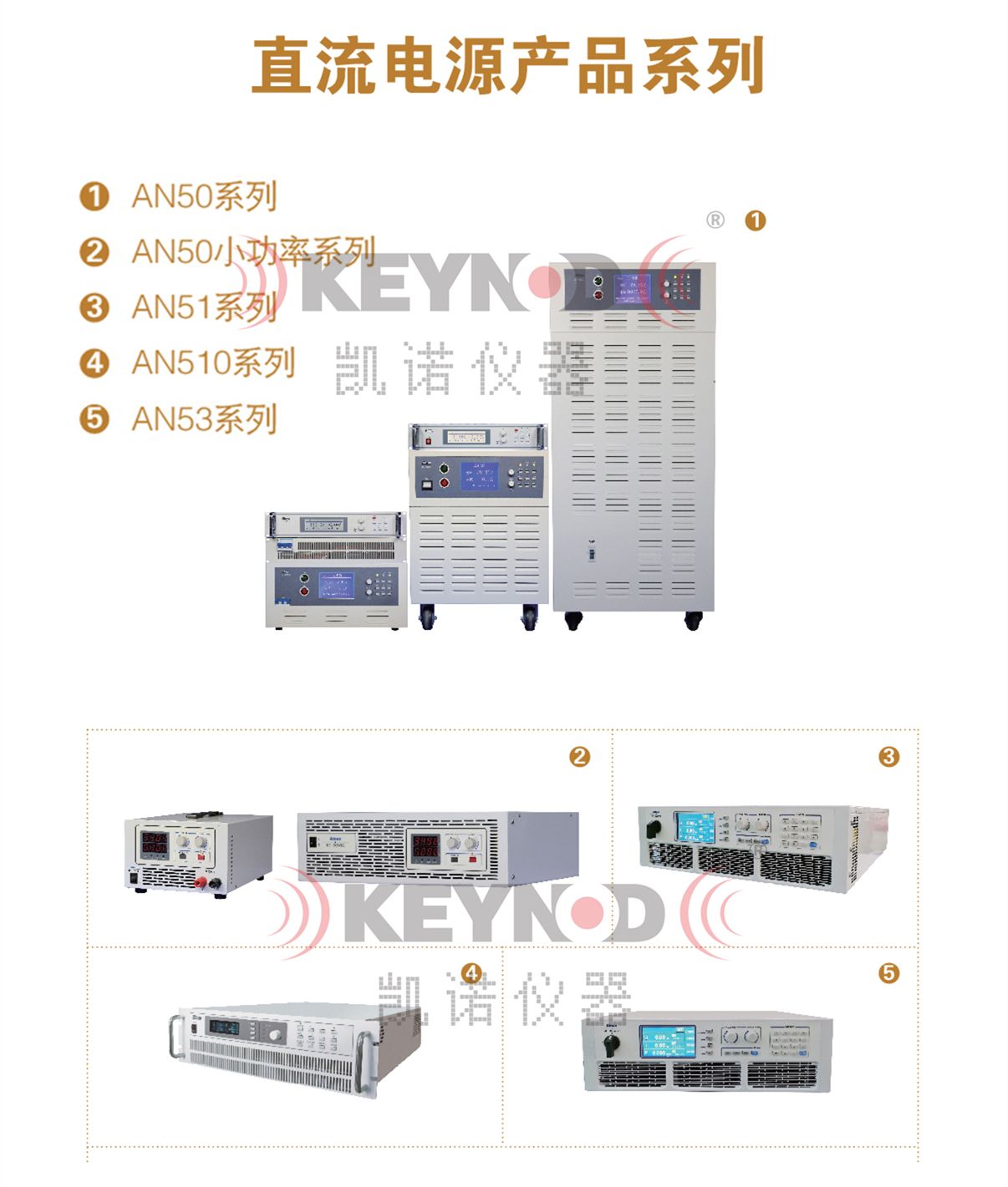AN50系列直流稳压电源、AN50系列小功率直流稳压电源、AN51系列可编程直流测试电源、AN510大功率可编程直流测试电源、AN53系列宽范围可编程直流电源;