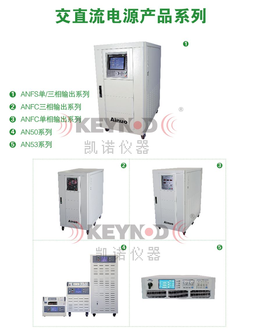 ANFC系列交流测试电源、ANFS系列三相交流变频电源、AN61系列可编程交流测试电源、AN60H系列标准机箱式变频电源、AN97系列智能变频电源;