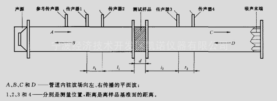 信号发生器产生信号,经扬声器变为声波进入声源管后产生平面声波A,遇到测试样品,一部分被吸收,一部分被反射,形成反射平面声波B;还有一部分经测试样品,进入接收管,形成平面声波C;平面声波C遇吸声末端,一部分被吸声,一部分被反射,形成反射平面声波D。