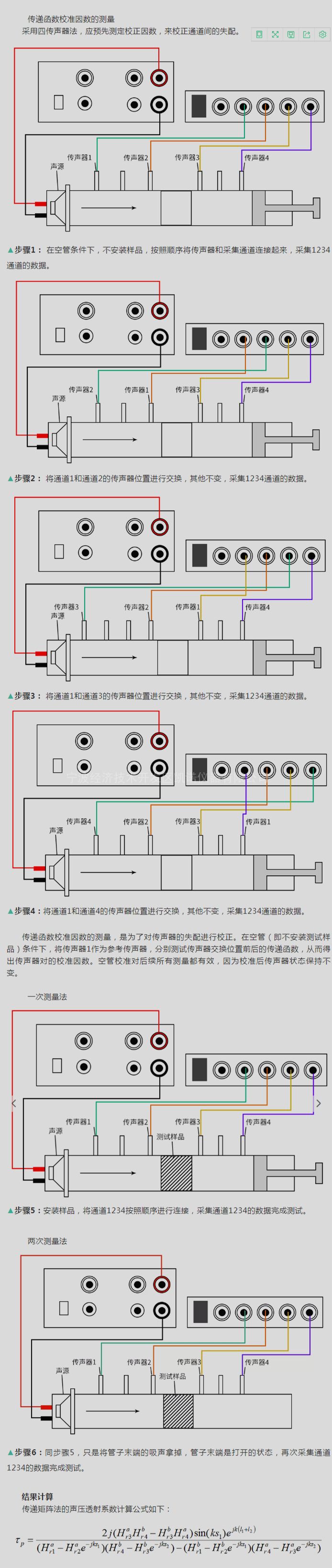 三、传递矩阵法应用相关产品:AHAI1032传递矩阵法材料传声损失测量系统按GBZ 27764-2011标准的要求开发而成。支持四传声器传递矩阵法中的一次测量与二次测量,可以对两面同性或不同性的材料进行法向透射系数的测量。由于四个传声器进行了相位及幅度的配对,也支持简化的驻波分离法的测量。一个测量可以同时得到:法向透射系数、法向入射传声损失、反射因数、吸声系数、材料中的复波数、特征阻抗、传递矩阵多个指标。●符合GBZ 27764/ASTM 2611-09等标准