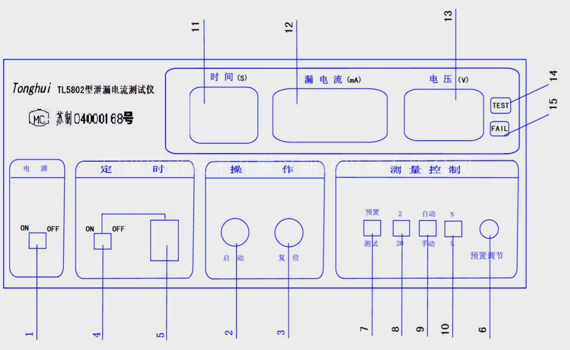 7.泄漏电流测试与预置转换开关:按下时结合泄漏电流预置钮可设定并显示泄漏电流报警值, 弹出时可测得并显示实际泄漏电流值;