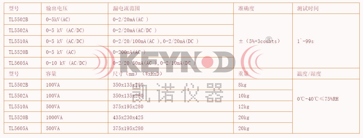 附:同惠TL5000系列耐电压测试仪规格指标对比图