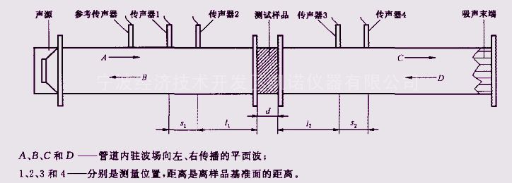 信号发生器产生信号,经扬声器变为声波进入声源管后产生平面声波A,遇到测试样品,一部分被吸收,一部分被反射,形成反射平面声波B;还有一部分经测试样品,进入接收管,形成平面声波C;平面声波C遇吸声末端,一部分被吸声,一部分被反射,形成反射平面声波D。