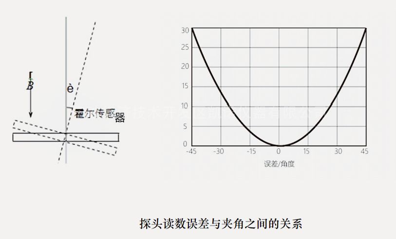 高斯计探头精度依赖于霍尔传感器与磁场之间的夹角。磁力线与传感器平面正交 (与传感器三轴均成直角)时取得樶大读数。与正交的偏离愈大,读数误差愈大。读数误差与夹角的关系如下图所示。严格测量中,必须考虑仪器、探头和磁场的容差。例如,一维高斯计CH-1600的读数准确度优于读数的0.05%。由于测量中的各种不定因素难于再现,因此很难给出高斯计和探头的絶对准确度指标。例如与磁场对准的1℃误差将产生0.15%读数误差。这意味着磁场的絶对测量准确度在不佳情况下将不会可靠的优于0.05%,更可能是0.10%至0.2%之间。