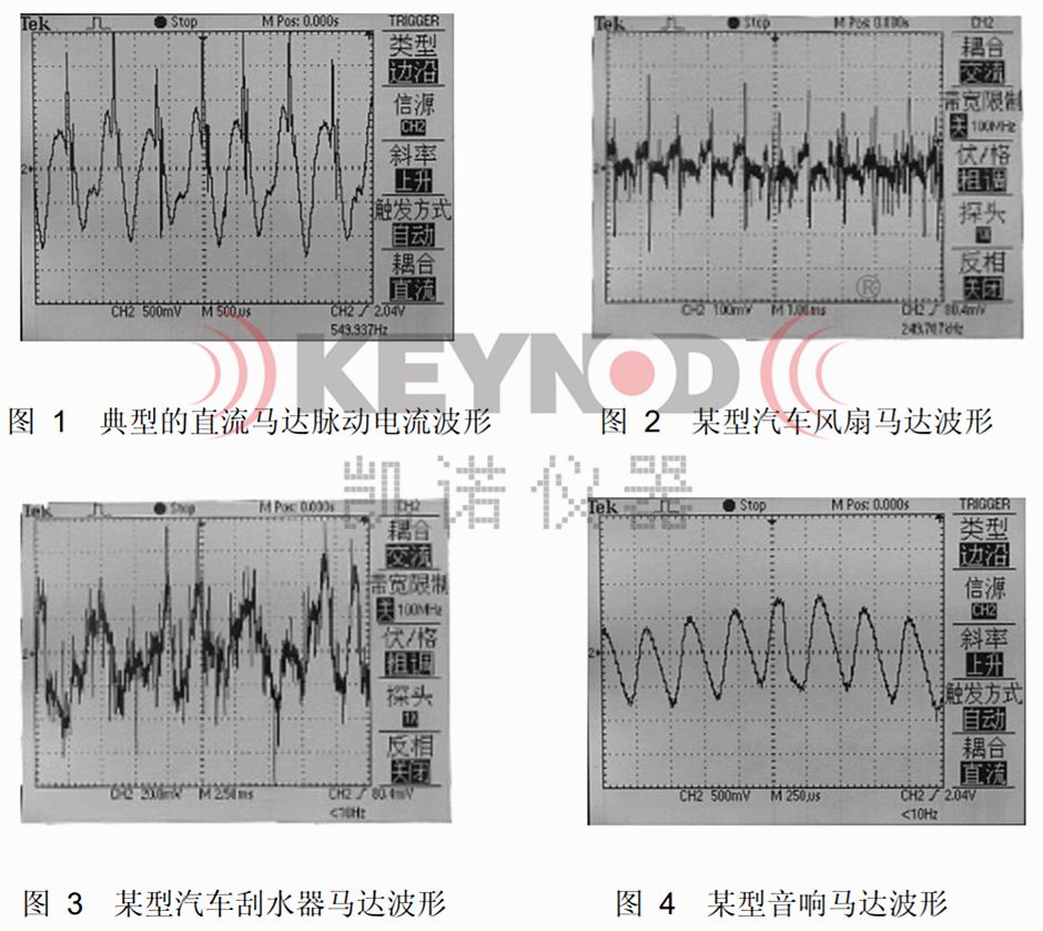 许多直流马达(如部分汽车马达等)为了削弱电火花的高频干扰,以满足电磁兼容(即EMC)的要求,其内部装有电火花干扰的吸收电路(如LC滤波电路等),这些电路的存在虽然大量吸收了电火花干扰能量,但也大大减弱了测量所需有用信号的幅值,甚至信号几乎与干扰及噪音处于同样水平(某型号的汽车风扇马达及刮水器马达的电流波形分别见图示),这些难以确定因素的客观存在将直接影响采用提取电枢电流波形脉动信号直接测量马达转速的准确性及对不同型号规格马达测试的兼容性,这也是目前市场上利用此原理制成的部分相关测试仪器极难兼容准确测试各种直流马达而达到马达制造厂家真正实用的根本原因。当然,由于类似于用于音视频产品的马达换向器间普遍装有压敏电阻以抑制电火花的高频干扰,其制造的工艺一致性程度也较高(较典型工作电流波形见图示),故对此类马达测试相对要容易些。汽车马达因普遍装有高性能LC滤波器造成有用的脉动电流信号极其微弱,且汽车马达的转速范围通常为每分钟几千转而接近电网工作频率,有用信号几乎淹没在干扰杂波中。