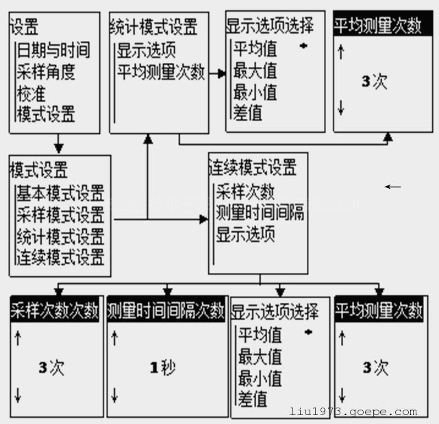 在“主菜单”页面下,通过按“上”、“下”键选择“设置”,按“确认”键,则进入“设置”页面中,在“设置”页面中,可以进行的操作有:日期与时间设置、采样角度设置、校准、模式设置、单位选择、背光时间设置、自动关机时间设置、清空测试数据、恢复出厂设置。可以通过“上”、“下”键选择,按“确认”键进入页面,按“测量”键返回上一级页面。*采样角度选择: