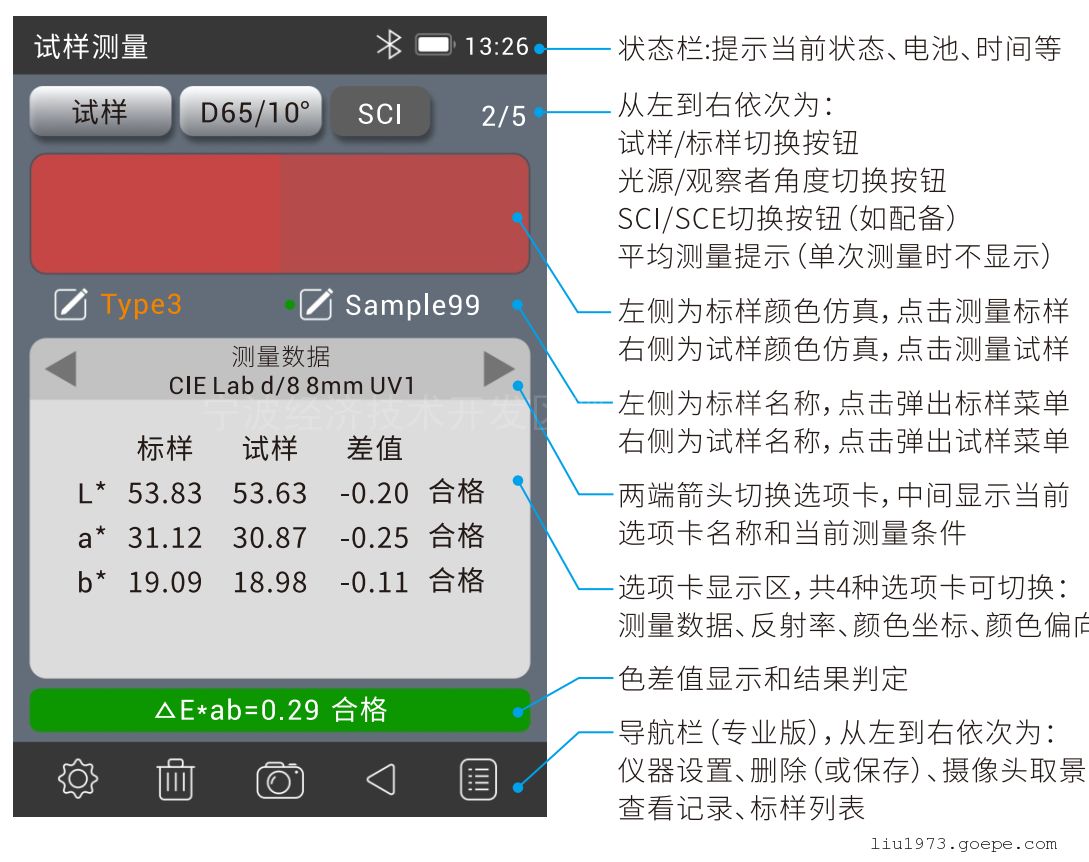 长按仪器开机键即可开机并进入校准界面,当仪器失去校准周期就会自动强制进行校准,当仪器还是周期范围内是不会强制进行校准。会立即进入测量界面。测量界面主要分为四个部分:状态栏、测量区域、测量结果区和导航栏。界面详细说明如下图:上方的按钮可以调节测量设置:试样/标样测量切换、光源/观察者角度切换、SCI/SCE切换(PRO版)、半均测量提示(单次测量不会显示);