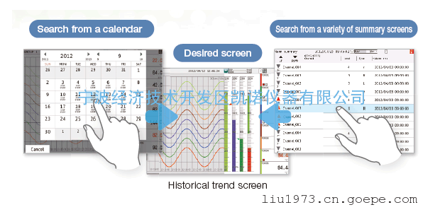 1.按照图示滑动手法即可直接无缝显示历史趋势,即使在测量过程中也可以通过滑动或拖拽趋势显示浏览数据。按照图示,通过日历,可以跳转到指定日期的波形画面。通过报警一览,可以跳转到发生报警的波形画面。