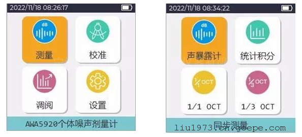 1.开机:按仪器屏幕下方电源按键3 s,进入声暴露计界面。通过两次短按电源键返回主界面,主界面显示有“测量”、“校准”、“调阅”、“设置”子菜单,界面右上角可检查电池符号确认电是否充满。2.噪声测量:测量界面按向上/下键选中“声暴露计”,,按确认键进入声暴露计列表界面。默认显示为测量主页面进入的“声暴露计”,按向上/下键选中“声暴露计”,按确认键弹出页面选择项,页面选择项有:“声暴露计”、“统计积分”、“1/1OCT”、“1/3OCT”,点击对应的项则进入对应选择项界面。点击“列表”框可以切换“醒目”界面和“打字”界面。测量时间默认是Ts(总值积分设置中的Ts值),当“测量状态=测量中/暂停”时显示T1测量持续时间),按向上/下键选中Ts,按确定键可以切换为Tl(剩余测量时间),Tl=(Ts-Tm),再按确定键切换为Tm。初始状态为“准备中”(图标),按向上/下键选中状态按确认键启动测量,状态变为“测量中”(图标),再次按确认键暂停测量,状态变为“暂停”(图标▇),测量完成后状态为“结束”(图标√)。