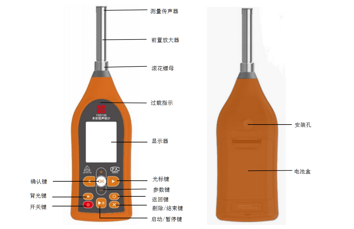 一、YSD136本安型声级计按键说明:(1)开关键:短按开关机;