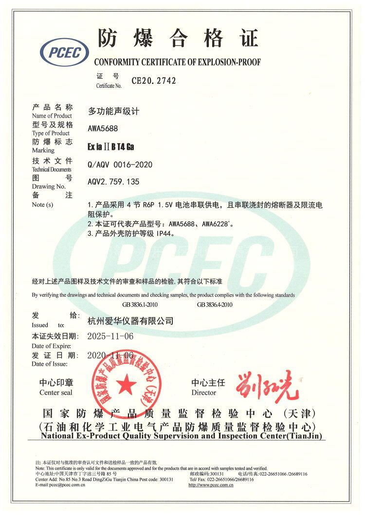 爱华AWA5688本安型声级计,目前已取得防爆合格证,是爱华AWA5688多功能声级计的升级产品,在AWA5688噪声统计分析仪的基本上又新增的声暴露功能,还可以选配1/1倍频程和1/3倍频程功能。