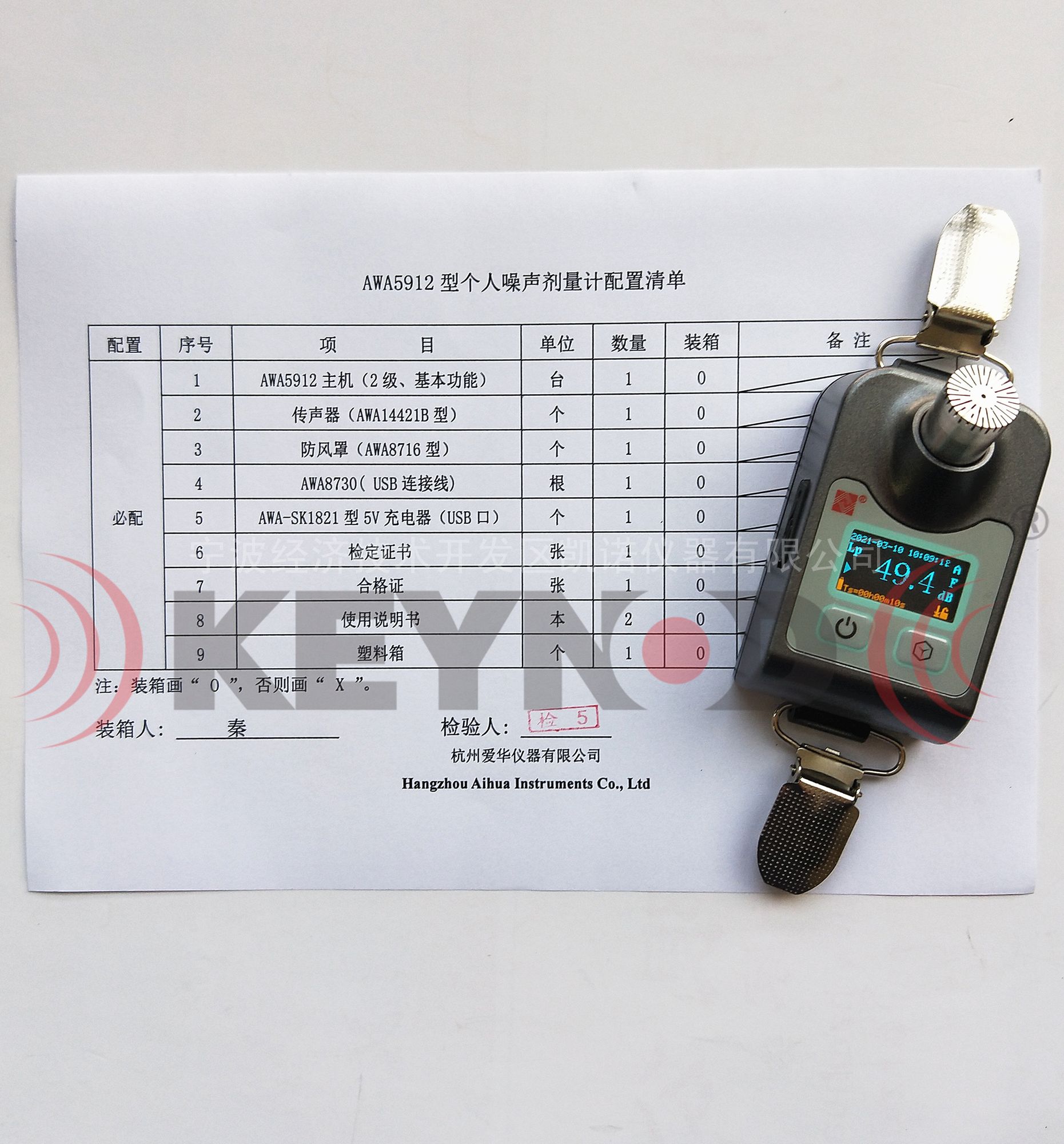 凯诺AWA5912型个人噪音检测仪是爱华公司新研制的一款个人噪声剂量计,集具积分声级计和个人声暴露计等功能,仪器小巧精致,方便佩戴,目前主要有普通款和防爆款两种。AWA5912 个人噪声剂量计可以通过mini USB 接口连接到计算机进行参数设置和数据管理分析。凯诺产品实拍装箱单图: