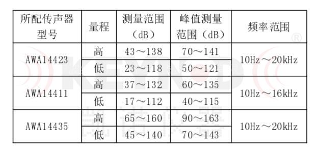 配置号 AWA5661-1型 AWA5661-1B型 AWA5661-1C型 AWA5661-2型 AWA5661-3型 特点 普通型 低噪声测量 高噪声测量 精密积分 超强功能 执行标准 GB/T 3785.1-2010 /IEC61672-1:2013 1级 传声器型号 AWA14425 AWA14411 AWA14435 AWA14425