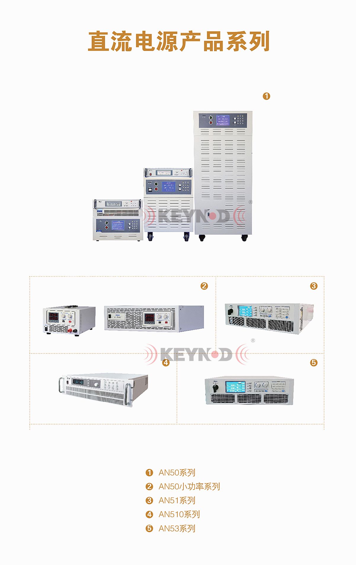 四、艾诺直流测试电源AN50系列相关产品:AN50系列直流稳压电源、AN51系列可编程直流电源、AN53系列宽范围可编程直流电源,ANFC系列交流电源、AN61系列可编程交流测试电源,AN9613接地导通电阻测试仪、AN9620泄露电流测试仪、AN9632交流耐电压绝缘测试仪、AN9635HS精密安规分析仪、AN9636HS电气安全性能综合分析仪、 AN9637H安规综合分析仪、AN9638H电气安全性能综合分析仪、AN16系列智能电气安规安全性能综合分析仪。