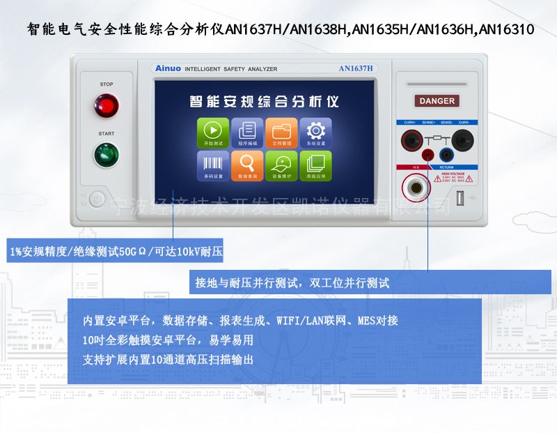 四、智能四合一电气安规综合分析仪艾诺AH1638H相关产品:AN50系列直流稳压电源、AN51系列可编程直流电源、AN53系列宽范围可编程直流电源,ANFC系列交流电源、AN61系列可编程交流测试电源,AN9613接地导通电阻测试仪、AN9620泄露电流测试仪、AN9632交流耐电压绝缘测试仪、AN9635H耐压绝缘电阻测试分析仪、AN9636H交直流耐压绝缘测试仪、 AN9637H多通道电气安全性能综合分析仪、AN9638H四合一电气安全性能综合分析仪、AN1637H四合一电气安全性能综合分析仪、AN1638H四合一电气安规综合分析仪、AN1640H八合一智能电气安全性能综合分析仪、AN1651八合一智能电气安规综合性能分析仪。