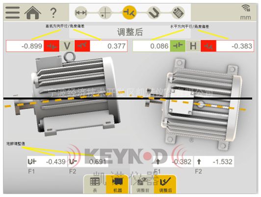 21.实时调整:调整时数据根据调整量实时变化,实时数据参考,测量完成后2个探头在任意位置跟踪设备的高低或左右可实时调整,如下图示:主机屏幕类型