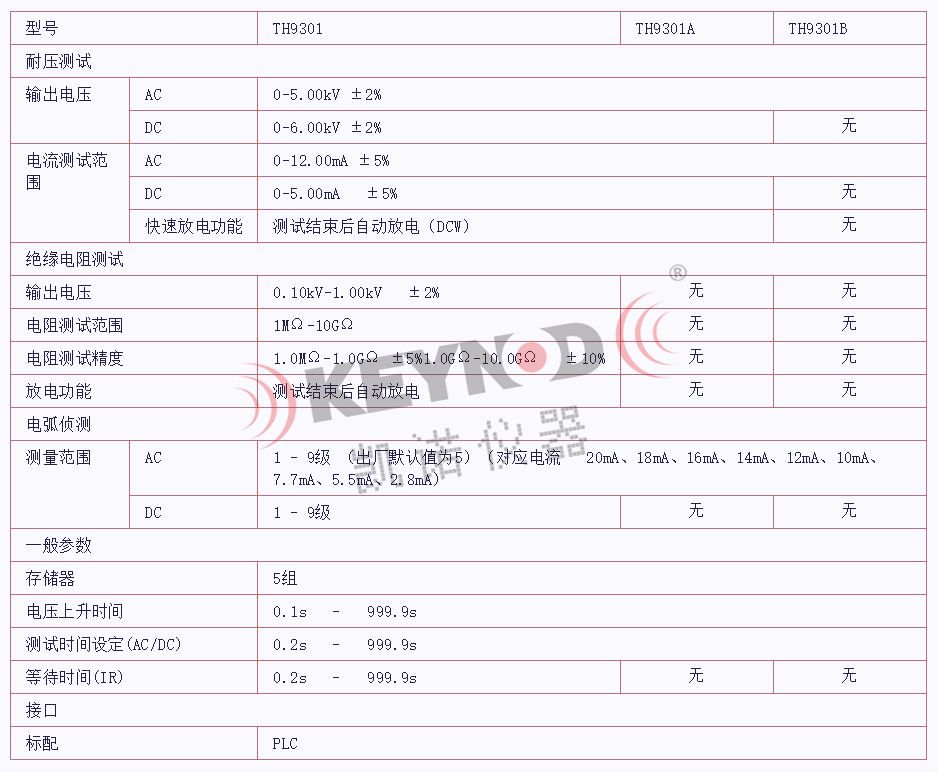三、同惠TH9301系列单通道交直流耐压绝缘测试仪主要性能参数表: