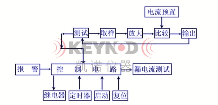 泄漏电源测试仪主要由阻抗变换、量程转换、交直流转换、指示装置、超限报警电路和实验电压调节装置组成。阻抗变换部分主要模拟人体对泄漏电流的感知特性,完全模拟人体阻抗;量程变换部分可方便用户根据实际负载大小选择合适的量程;交直流转换部分将交流 电压和电流信号转换成直流电压和电流信号;指示装置显示测试电压和实际泄漏电流以及测 试时间;超限报警电路完成对不合格品的报警和指示并自动切断高压;电压调节装置可以根据不同的标准需要调节合适的测试电压。