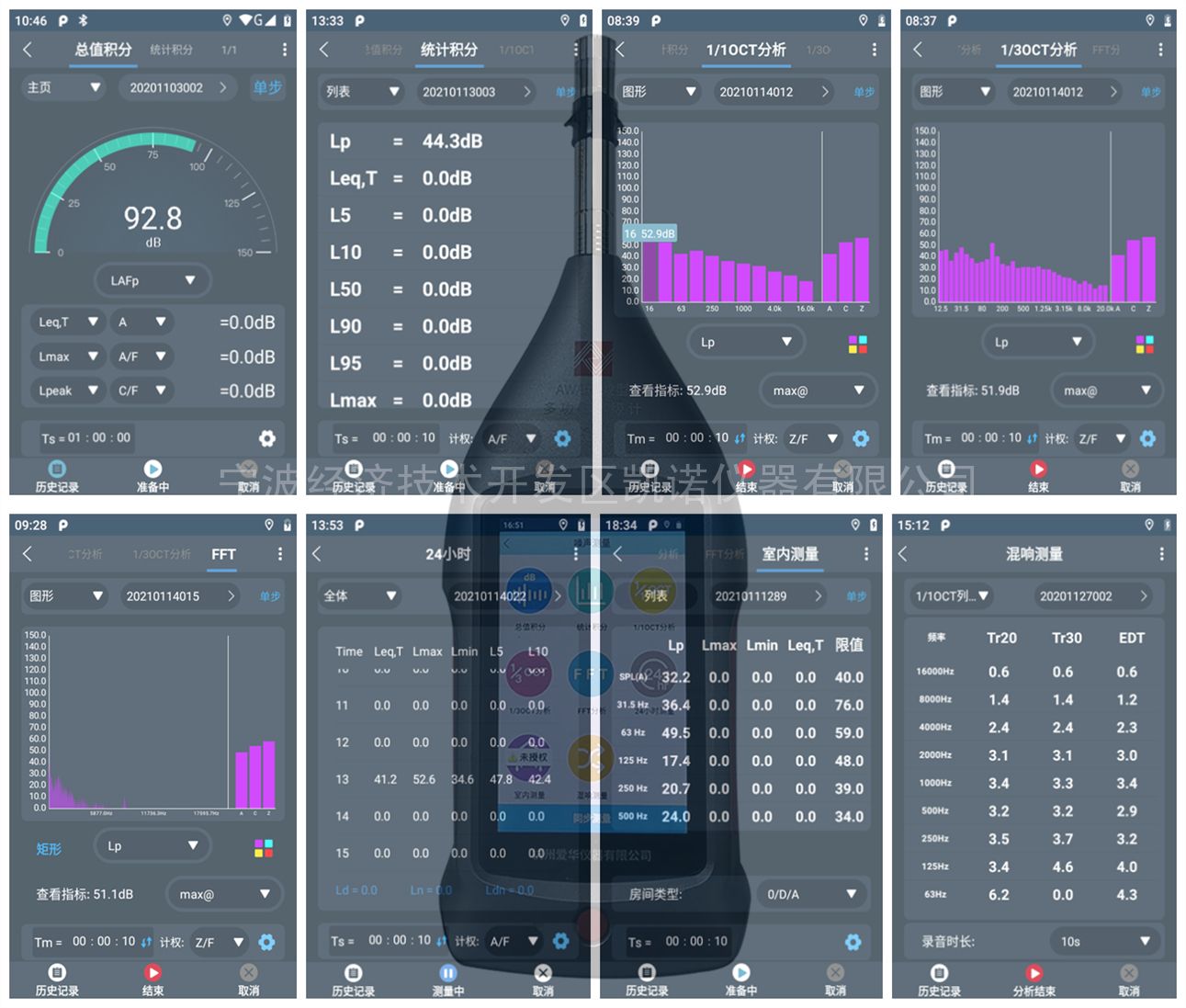 总值积分、统计积分、24小时自动监测、1/1 OCT、1/3 OCT、FFT分析、室内测量、混响时间、STI等