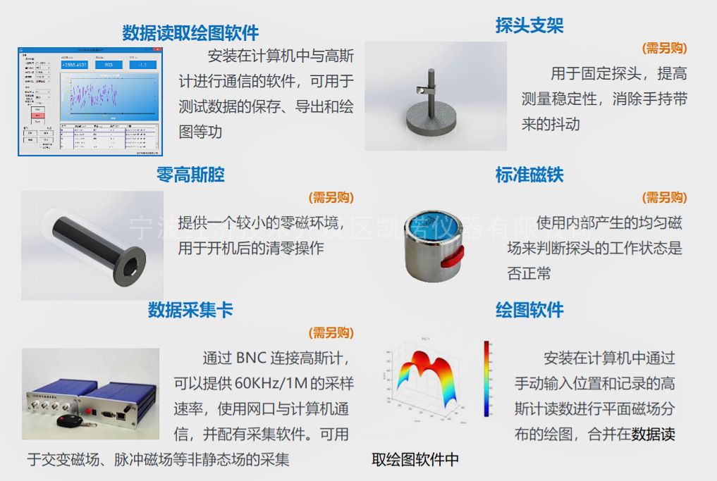 CH-3600G三维高斯计可选配件主要包括数据读取绘图软件、零高斯腔、数据采集卡、探头支架、标准磁铁、绘图软件。