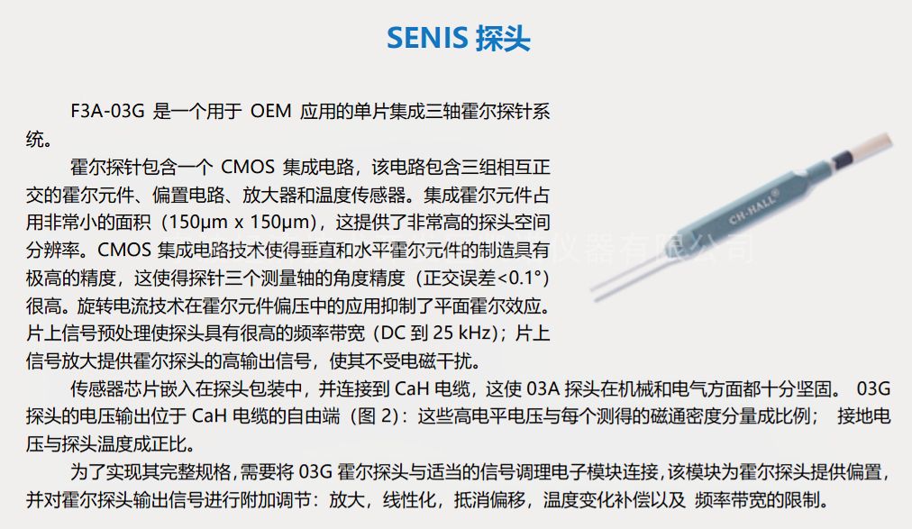 宁波翠海CH-3600S三维高斯计配套进口SENIS三维探头,测量直流磁场;翠海CH-3600三维高斯计可应用于交直流磁场。如您需要三维高斯计,非常建议您了解一下翠海CH-3600系列,配套本厂高精度HALL探头,技术基础雄厚,质量可靠,完全可以替代很多进口高斯计。关于进口SENIS三维探头介绍如下: