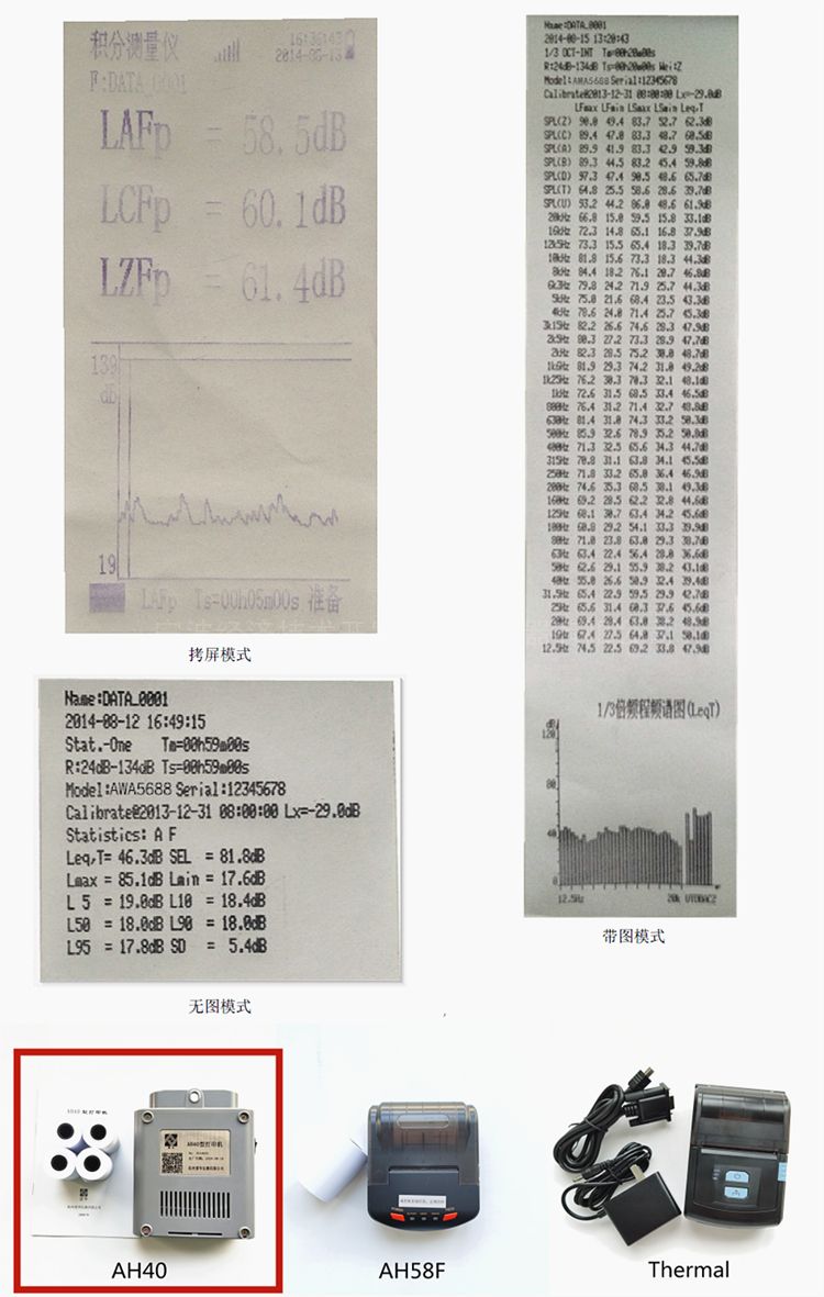 AWA5688积分声级计测量结果通过AH40 微型打印机打印。打印前应将AH40 微型打印机与仪器对接好,打开AH40 微型打印机的电源,并确定联机灯点亮。在打印前,可以将仪器打印功能设为自动或手动,设为自动后,在每次测量结束后自动打印测量结果。仪器不仅可以进行单组打印、多组打印、24小时测量结果打印,选择统计频谱功能的,还可以统计、累积分布图打印。打印模式有无图、简洁、带图和拷屏可选。有些分析模式下没有图形,如总值或个人声暴露的测量结果。无图时,打印结果中不含图形;简洁时,打印结果中不含仪器机号、校准日期、灵敏度信息等;拷屏时,将当前显示界面打印出来。
