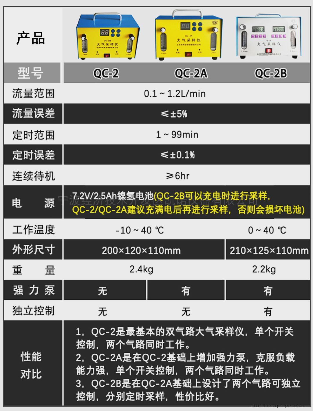三、双气路大气采样仪相关产品:QC-2A强力型双气路、QC-2B型双气路独立控制。参数对比如下: