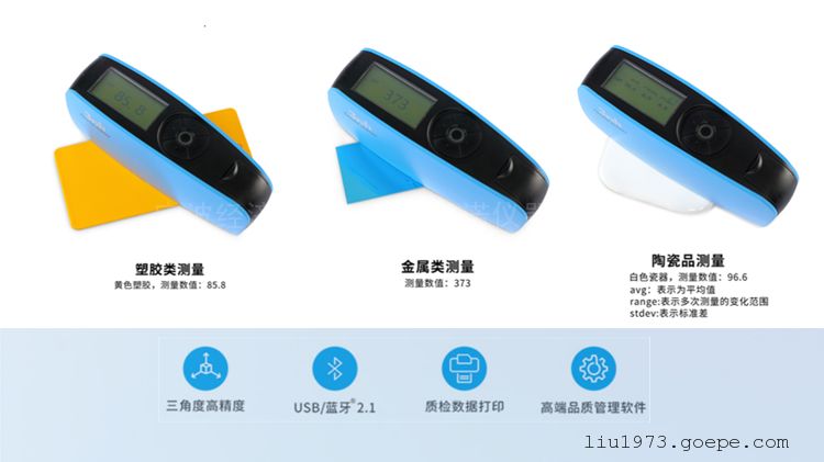 5.特性:可用于油漆油墨、涂料、纸张印刷、塑胶电子、家具、陶瓷、电镀、五金、大理石等行业的光泽度测量和光泽度数据传递。