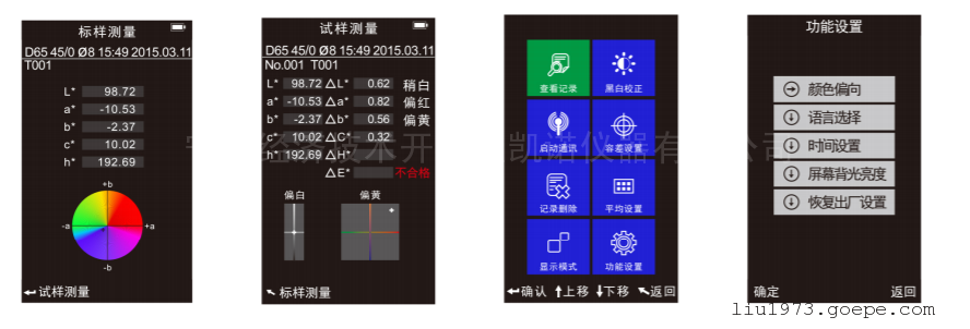 9.显示:色度值,色差值/图,合格/不合格结果,颜色偏向