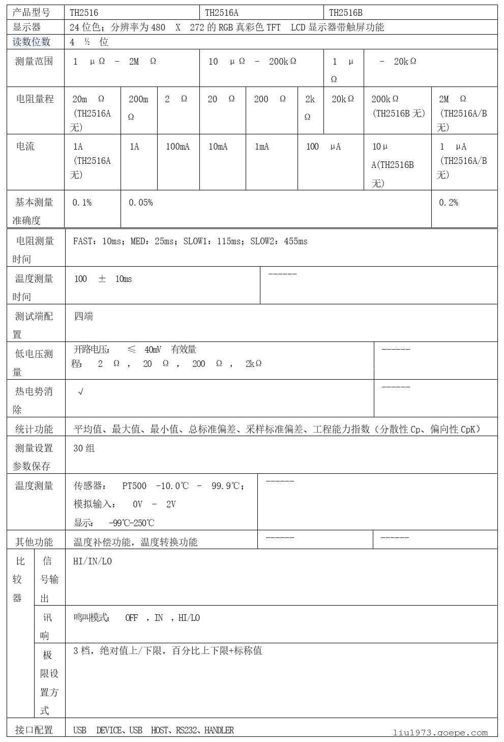 三、TH2516系列同惠直流电阻测试仪技术参数对比: