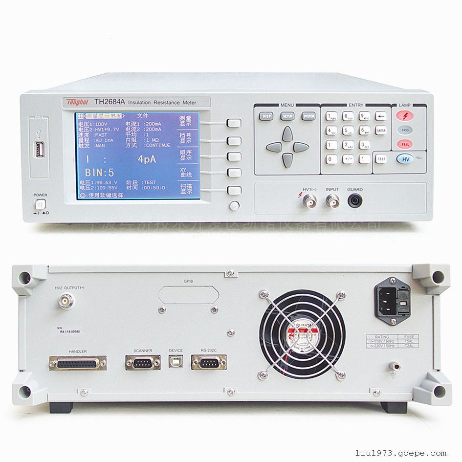 同惠TH2684A型是一款高精度智能化绝缘电阻测试仪,该仪器能快速测量电子元器件,介质材料,设备和电线电缆等绝缘性能。仪器采用大尺寸的液晶,人性化的菜单布局,使用户可更方便的操作仪器;可由用户自行编程测试步骤,樶多可达18步。例如,用户可编程充电,等待,测试,放电等,每个步骤樶长可持续100s。TH2684A标配RS232,USB DEVICE,Handler等接口。其中Handler接口为实现自动测试系统提供了方便。扫描口,则为大量元器件的测试提供了方便。用户还可以配一台扫描仪来加快元器件的测试。