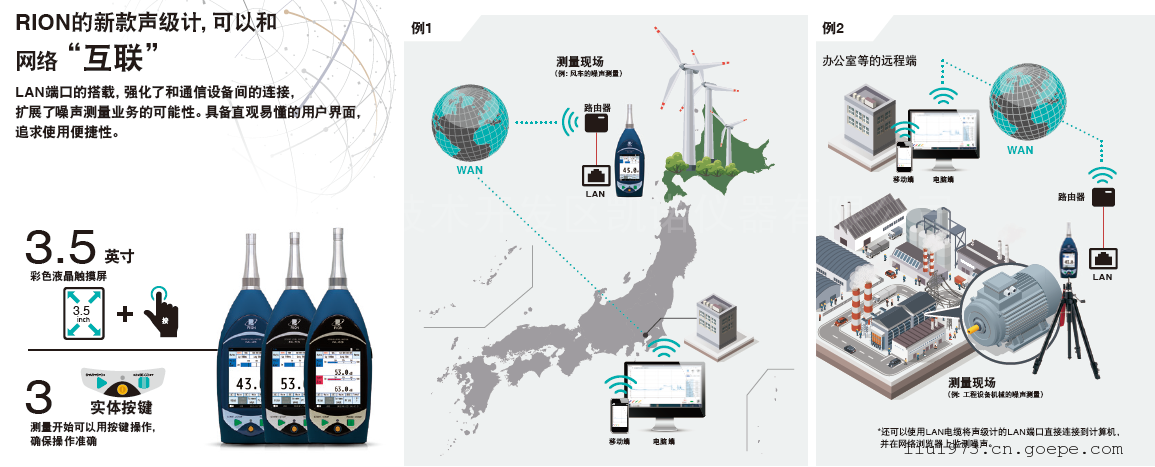 RION的新款声级计,可以和网络“互联”,LAN端口的搭载,强化了和通信设备间的连接,扩展了噪声测量业务的可能性。具备直观易情的用户界面,追求使用便捷性。还可以使用LAN电缆将声级计的LAN端口直接连接到计算机,并在网络浏览器上监测噪声。