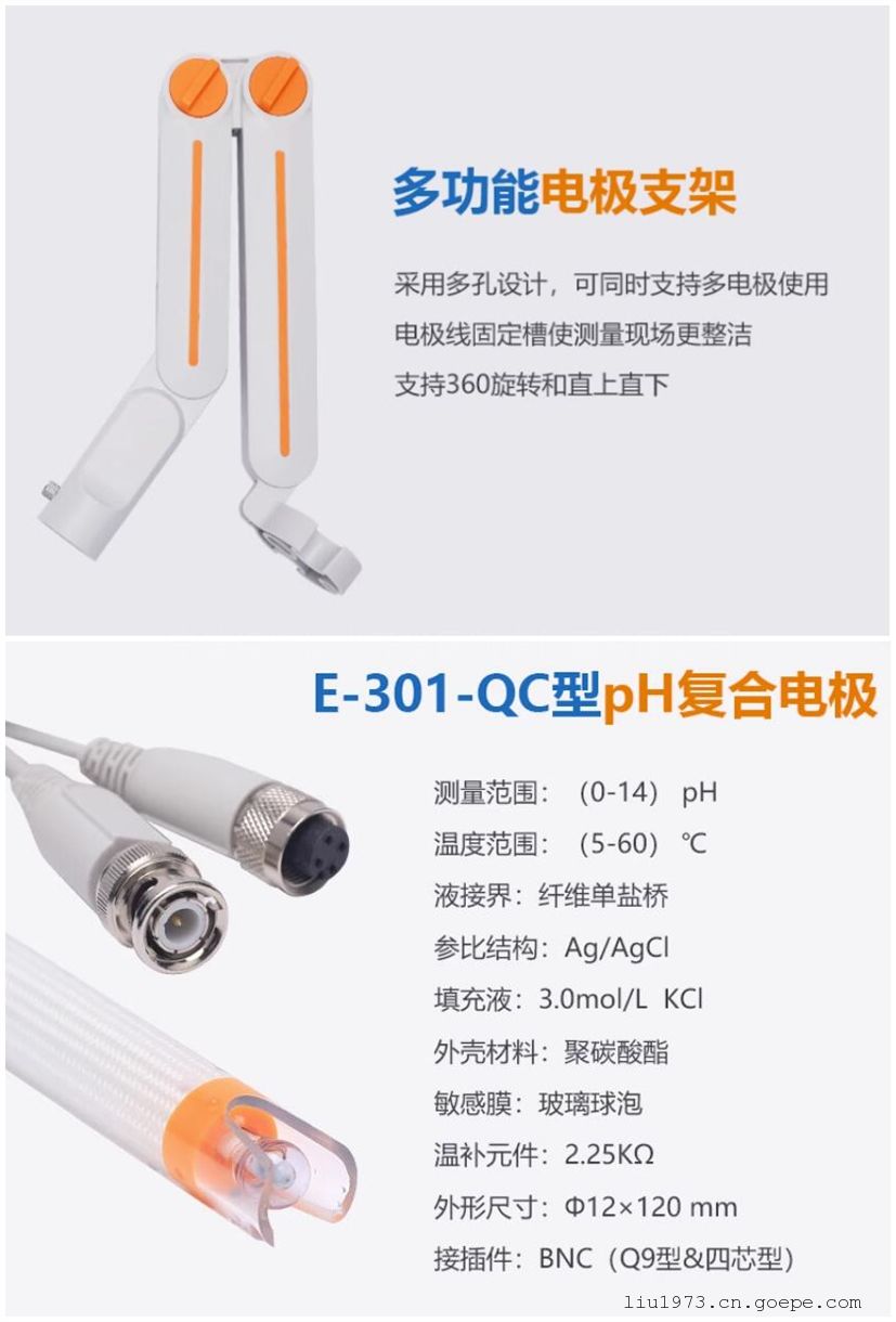 5.标配电极:E-301-QC型pH三复合电极,配套测量范围:(0.00~14.00)pH