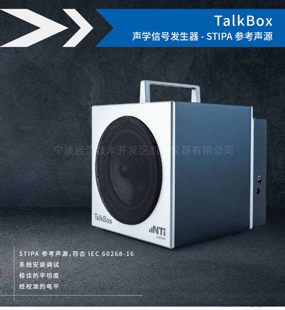 详细信息| 询价留言品牌:瑞士NTi 型号:TalkBox 加工定制:否 外形尺寸:150x150x175 mm 重量:3.5 ㎏ 加工定制:否 STIPA测试声源—声学信号发生器TalkBox瑞士NTi