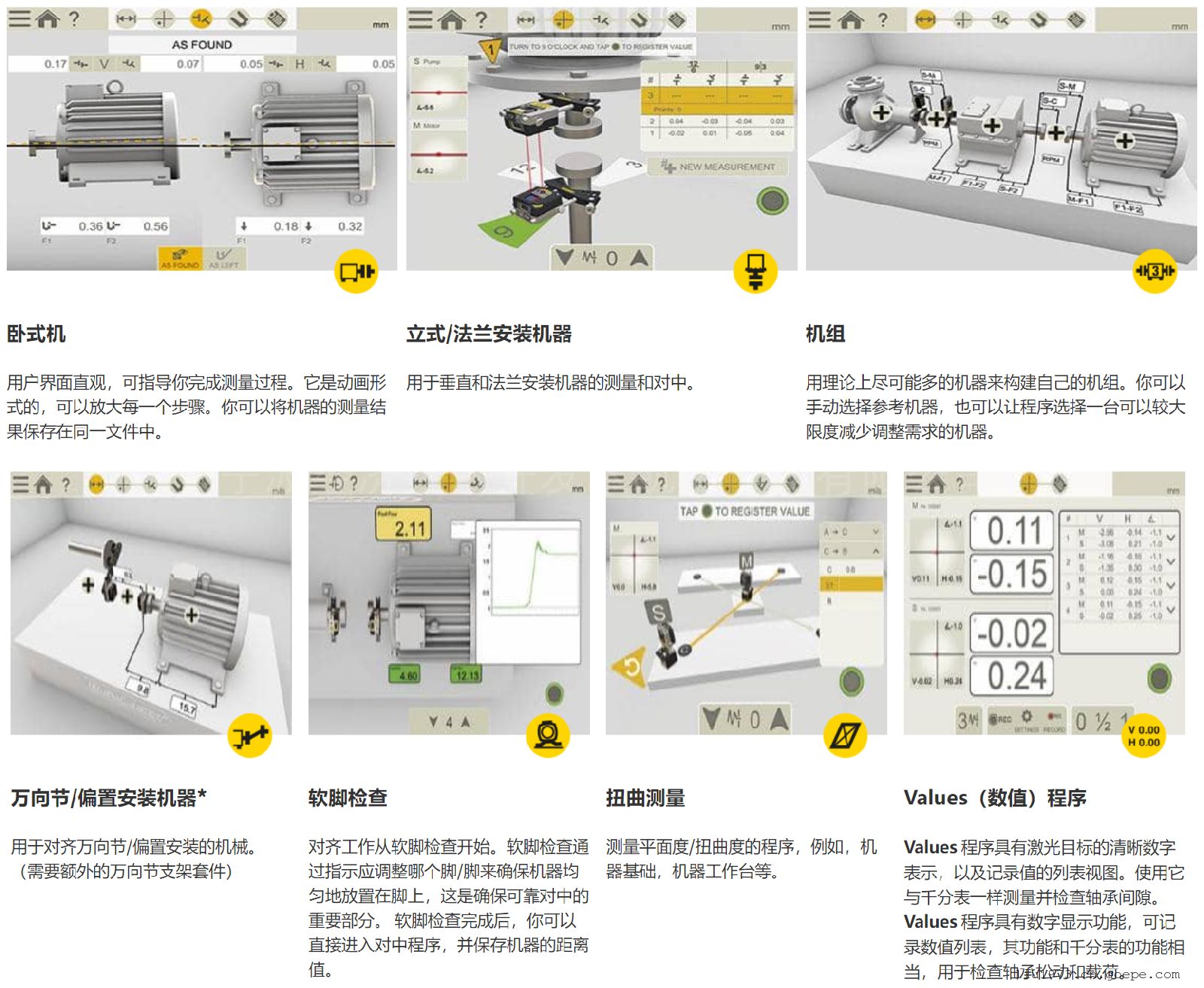 6.垂直/法兰安装的机器:立式轴对中功能便于该类型设备测量和校准;
