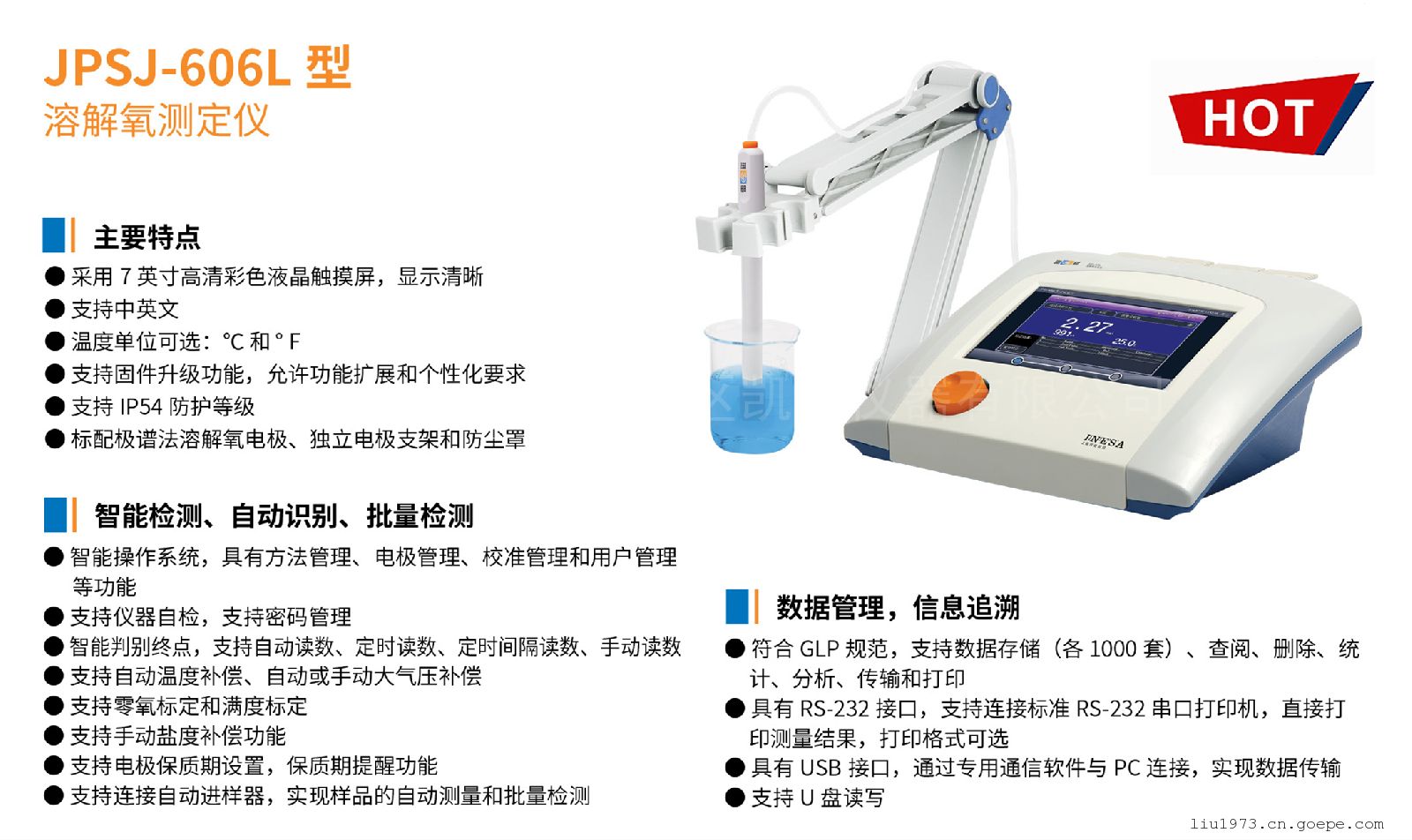 一、上海雷磁品牌JPSJ-606L是一款智能台式溶解氧测定仪,7寸彩色触摸屏设计,具有智能操作系统,可进行方法管理、电极管理、数据管理和用户管理;支持仪器自检和用户分级权限管理,支持密码管理;支持连接自动进样器,实现样品的自动测量和批量检测。