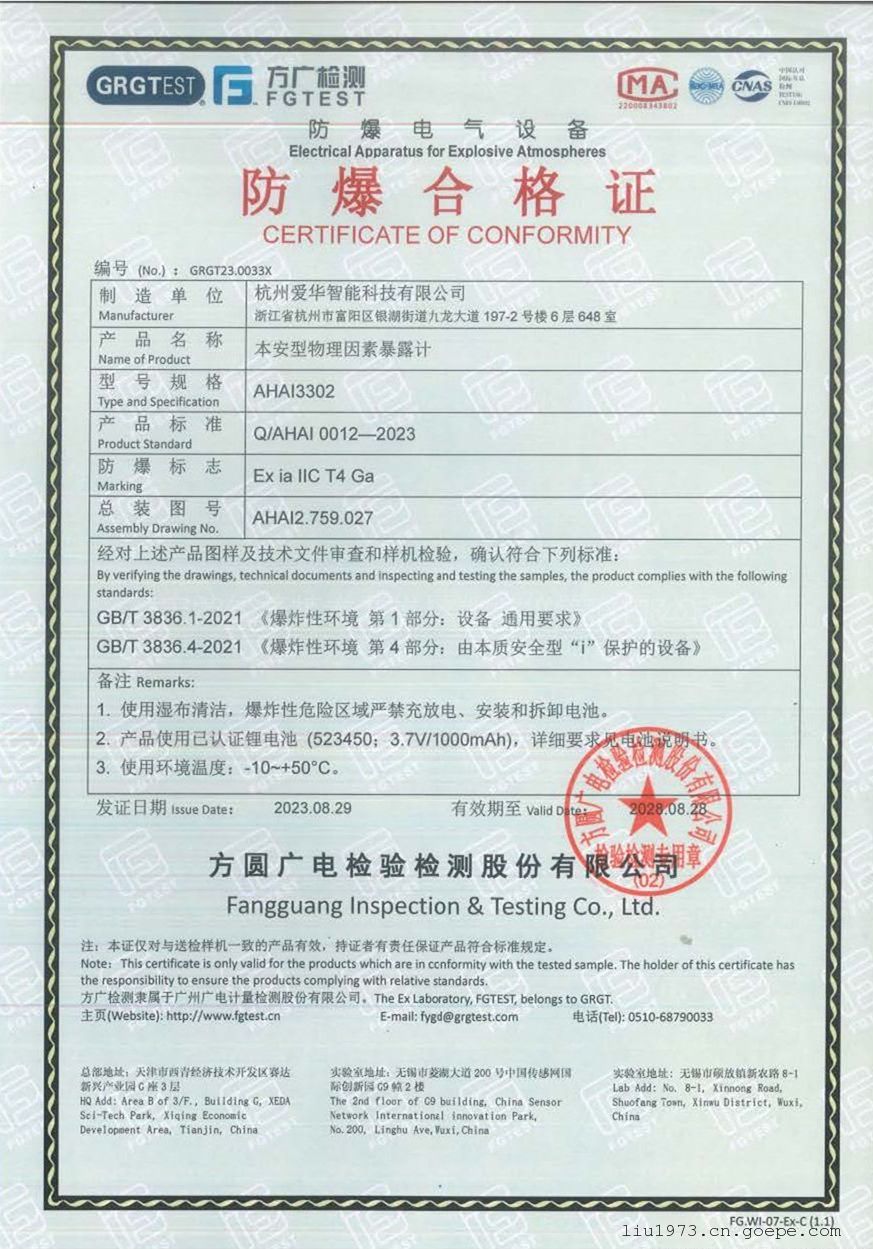 AHAI3302物理因素暴露计是根据GB/T 3836.1-2021《爆炸性环境第1部分:设备通用要求》、GB/T3836.4-2021 《爆炸性环境第4部分:由本质安全型“i” 保护的设备》的规定制成本安型。本产品的防爆结构是经过国家指定检验单位审查,检验合格,并签发相应防爆合格证的工厂用防爆电器设备。