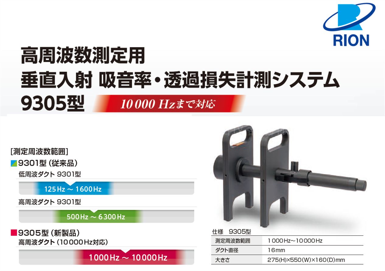 详细信息| 询价留言品牌:RION理音 型号:9305 加工定制:否 测量范围:1000Hz~10000Hz 外形尺寸:-- mm 重量:-- ㎏ 用途:非常适合测量电动汽车和其他应用中所使用的吸声和隔声材料的声学 外形尺寸:-- mm 重量:-- ㎏ RION理音9305垂直入射吸声系数丨降噪指数高频测量系统