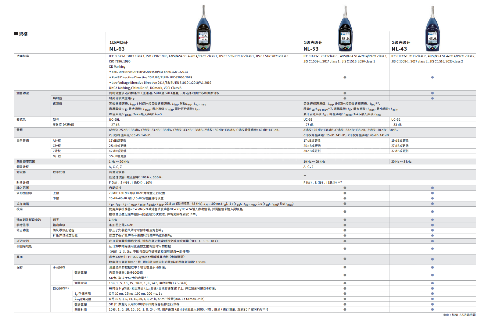 一、NL-43/53/63系列理音RION声级计相关参数对比如下:*IP54防水性能(麦克风除外)有助于降低因骤雨等导致的故障风险。