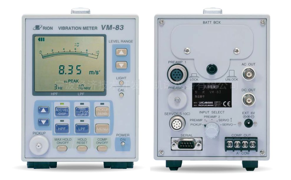 日本RION理音VM-83测振仪具有加速度、速度、位移的3种模式。可连结伺服加速度计 LS-10C,主要用于以转机为中心的工业机械设备的维修、管理和点检等工作,在适当频率范围测量加速度、速度和位移,从而评价机械的振动状态。