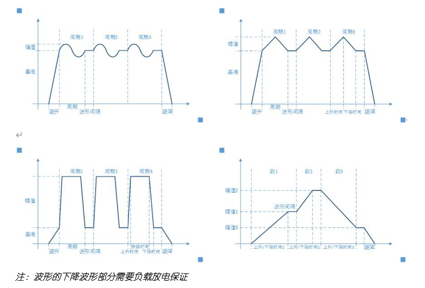 可产生多种规则波形,如正弦、三角形、锯齿、矩形、脉冲、梯形和折线波、以及混合以上波形的组合波形,并将编辑好的波形叠加到输出电压或电流之上。预设函数会为用户提供所有必须的参数,如基准、周期数、波形幅值、时间等一套完整的配置参数;