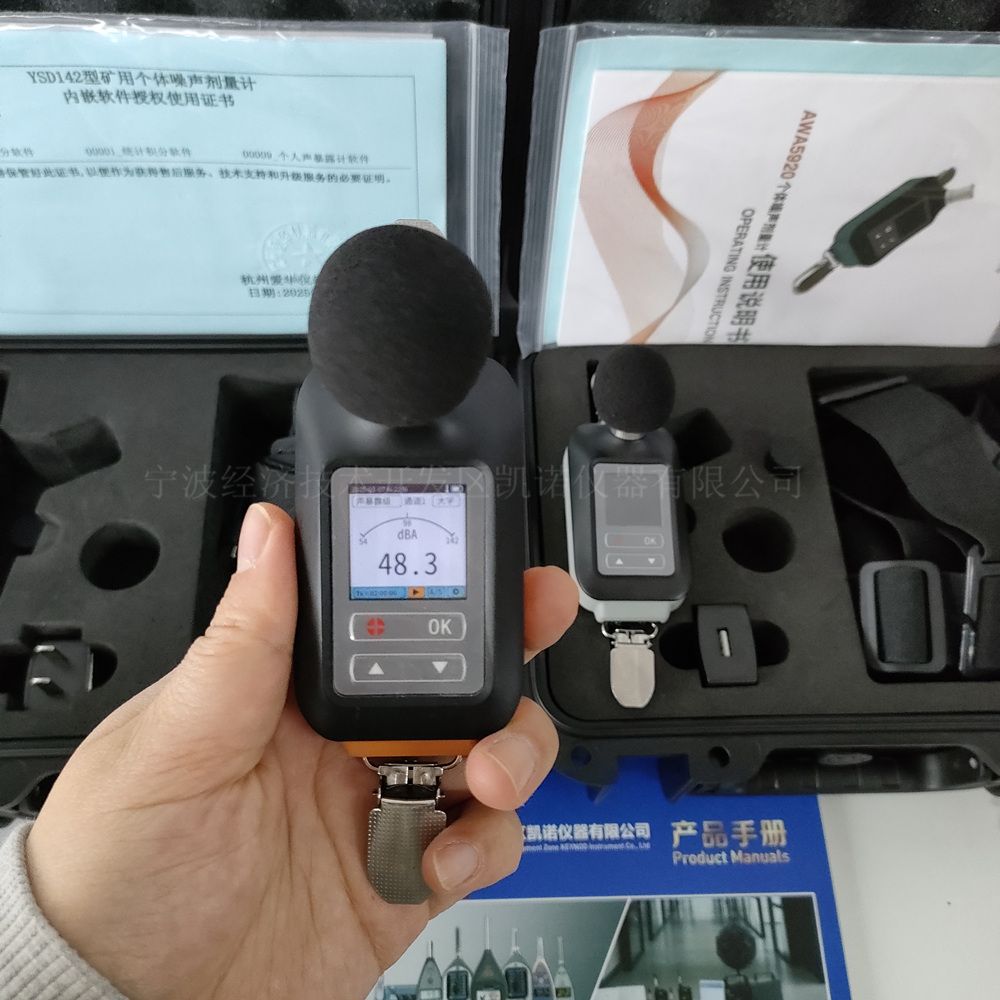 宁波凯诺仪器总代理销售杭州爱华新款矿用个体噪声剂量计YSD142,采用数字信号处理技术,可以同时测量多种评价指标,模块化设计,用户可以根据需要选购相应的模块。相关产品:AWA5920个体噪声剂量计。宁波凯诺仪器供货实拍(左YSD142,右AWA5920):