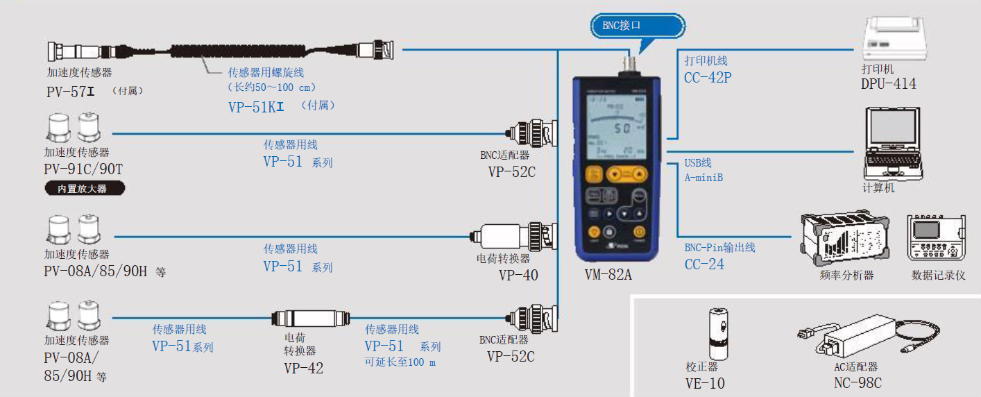 三、日本理音通用振动计VM-82A规格参数:1.压电式加速度传感器PV-57I(付属)
