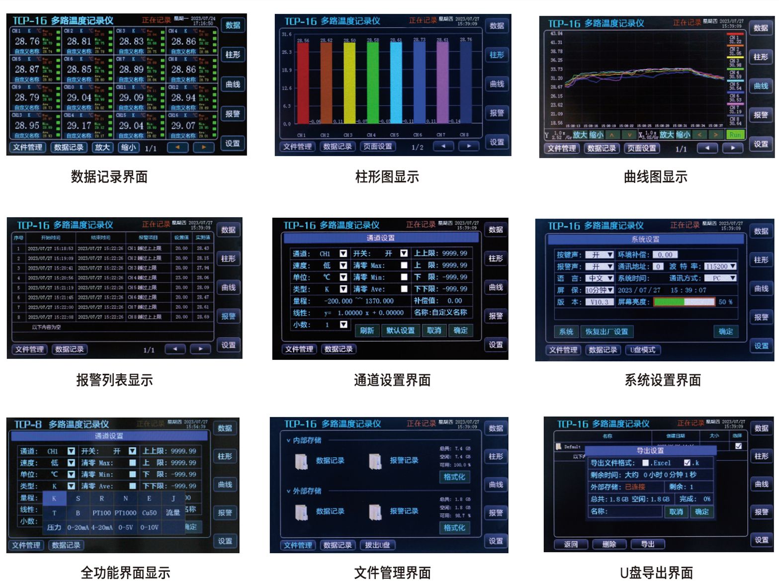在数据主界面中,每个通道都具有报警显示,同时指示各路通道的下下限、下限、上限、上上 限报警,各通道的报警界限都可在设置中调整,适应各种场合应用;报警后仪器会自动记录报 警信息,同样可以自动保存在仪器内部内存卡及外部 U 盘上,掉电不丢失;
