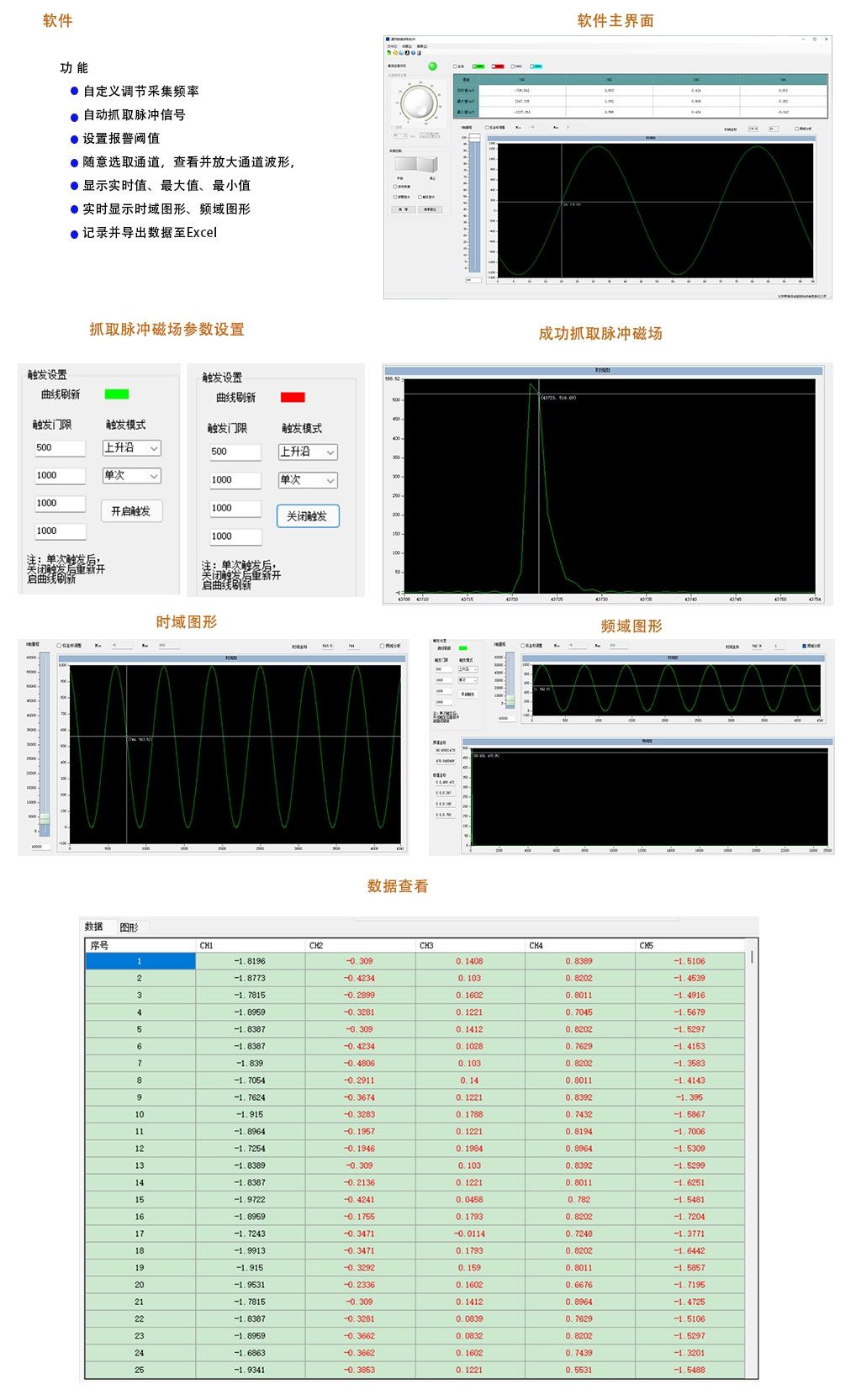 二、高斯计高频磁场测试翠海CH-1600S系统主要包含有高斯计主机、高频测试磁场传感器、高斯计数据采集卡和显示软件组成。其中高斯计主机提供高精度横流电源使得磁场传感器正常工作并通过仪器校准保证磁场测量在一定的高精度范围之内,高频磁场传感器具有磁场响应频率高、线性度好、磁场测量范围大等优点满足目前市面上大多数高频磁场的测量需求;高斯计数据采集卡可实时高速采集高斯计的模拟电压信号并上传到上位机显示软件中进行实时显示和分析,使得实时呈现出磁场的变化关系,也可在软件中对采集的实时数据或波形进行保存和FFT处理,以得到我们需要的磁场现象。
