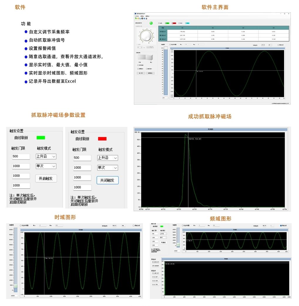 该系统已经广泛应用于盆地磁刺激治疗仪、经颅磁刺激仪等磁刺激治疗仪的脉冲磁场测量,磁场测量范围单峰值可到15T,脉宽可达到us级别。另外本套测量系统也广泛应用于高频加热炉等测量高频磁场的环境中。